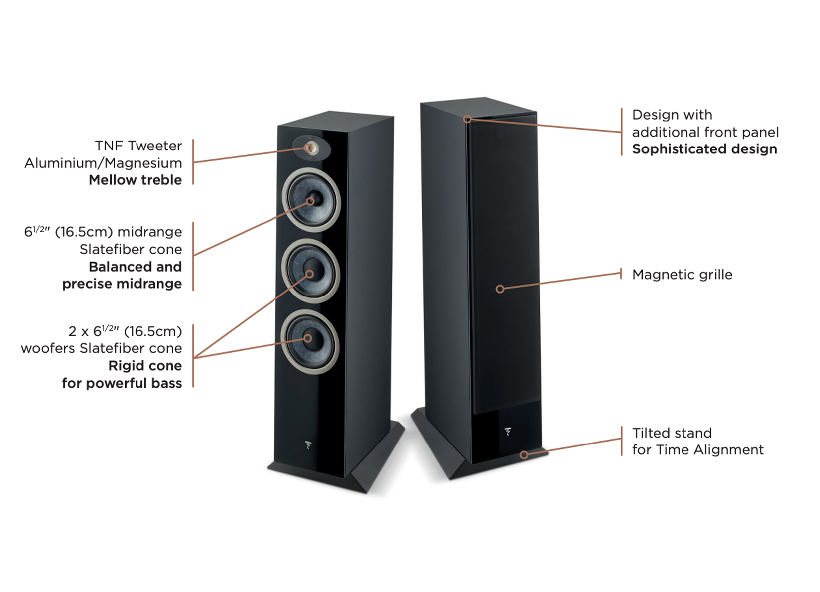 | Features | Type: Bass-reflex 3-way floorstanding loudspeaker Speaker Drivers: 2 x 6.5" (16.5 cm) Slatefiber bass, 6.5" (16.5 cm) Slatefiber midrange, 1" (25 mm) Al/Mg inverted dome TNF tweeter Sensitivity: 91 dB Bandwidth: 48 Hz – 28 kHz Low-Frequency Cut-Off: 39 Hz Nominal Impedance: 8 Ω Minimal Impedance: 2.9 Ω Recommended Amplifier Power: 40 – 250 W Crossover Frequencies: 270 Hz / 2700 Hz Dimensions (HxWxD): 39" x 8 3/8" x 15 1/4" (98.9 x 21.2 x 38.8 cm) Net Weight (with grille): 44.09 lbs (20 kg) Box Dimensions (HxWxD): 13 3/8" x 18 7/8" x 43 1/4" (34 x 48 x 110 cm) Gross Weight (with packaging): 54.01 lbs (24.5 kg) |