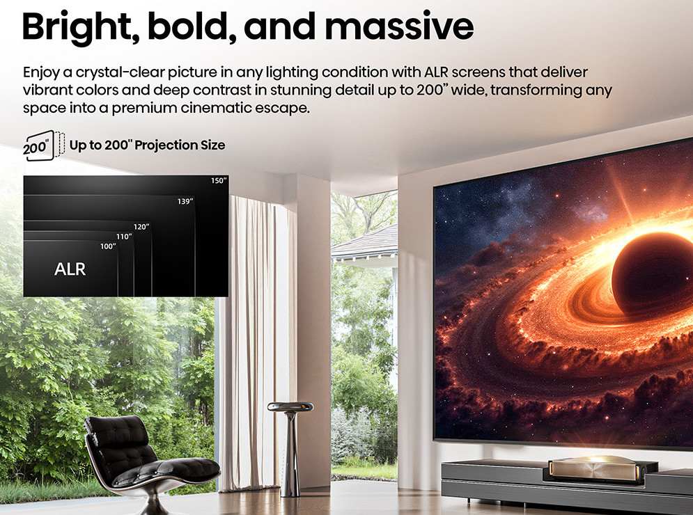 The L9Q delivers smooth and immersive viewing with native 4K resolution and advanced MEMC motion processing. Using AI-powered frame prediction and object tracking, it ensures fluid transitions without distracting artifacts or unnatural effects. This is particularly noticeable on expansive projections of up to 200 inches, where clarity is essential.