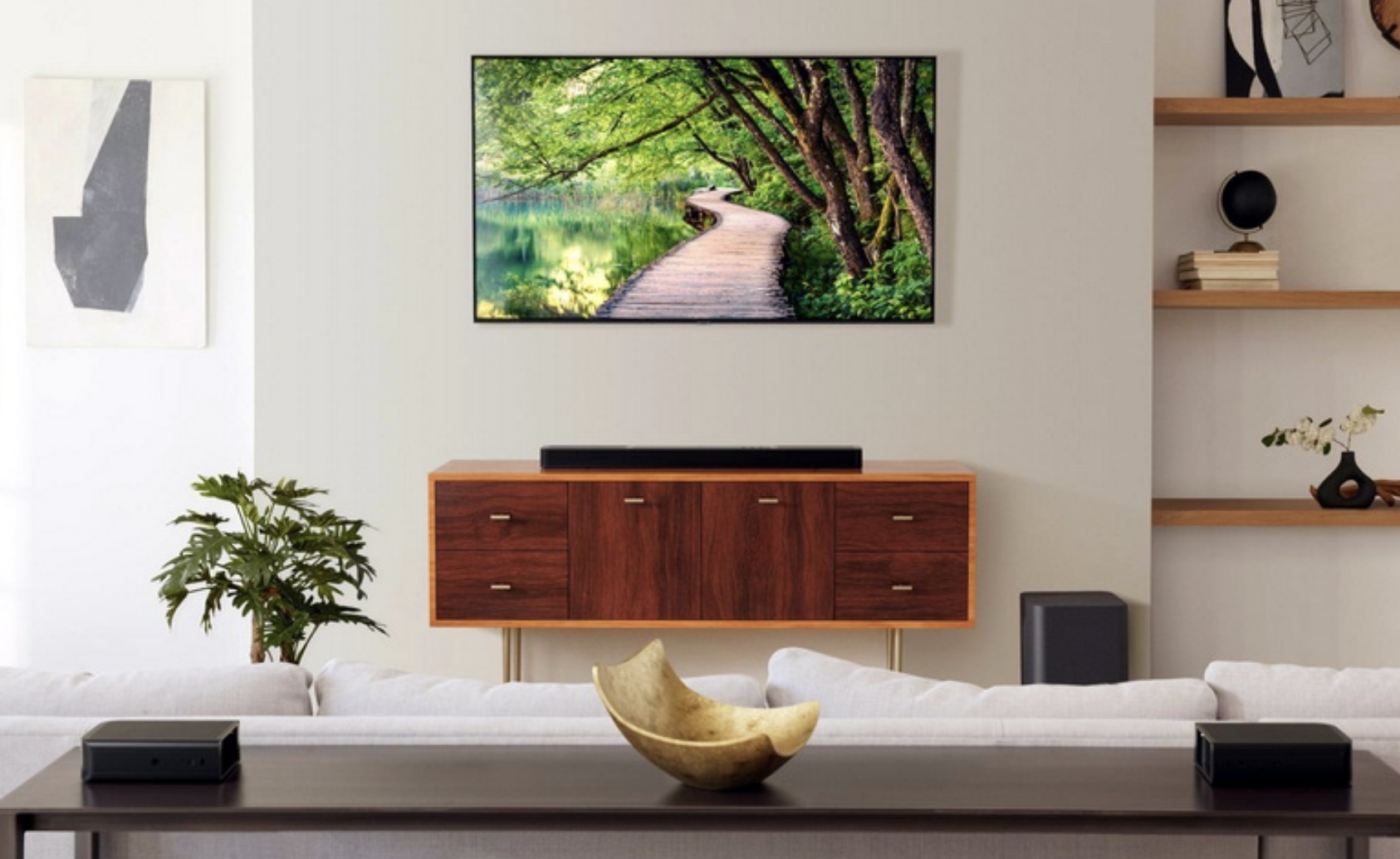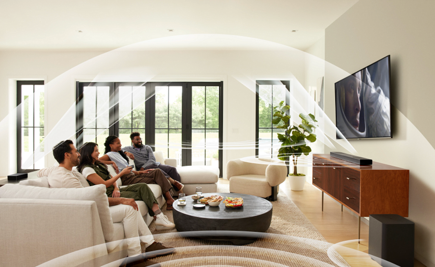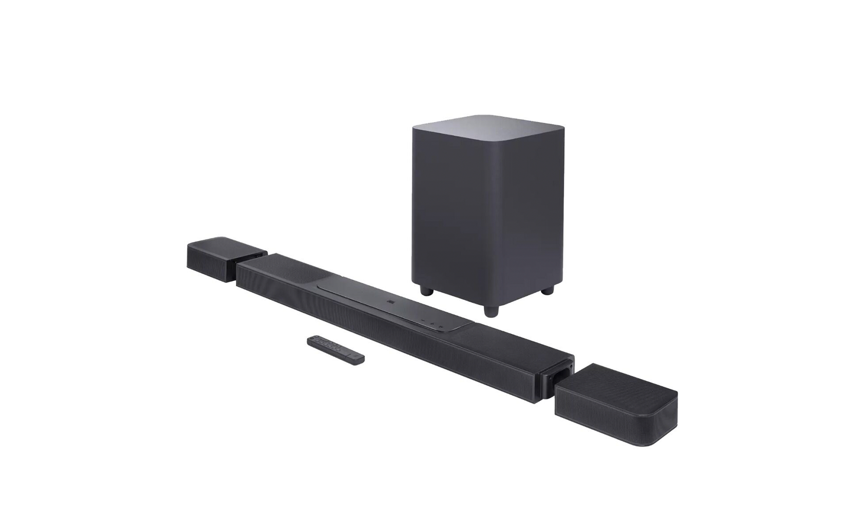Sound System: 11.1.4 channel Power Supply: 100 - 240V AC, ~ 50/60Hz Networked Standby Power: < 2.0W Operating Temperature: 0°C - 45°C Total Speaker Power Output (Max @ THD 1%): 1170W Soundbar Output Power (Max @ THD 1%): 650W Surround Speaker Output Power (Max @ THD 1%): 2 x 110W Subwoofer Output Power (Max @ THD 1%): 300W Soundbar Transducer: 6x (46x90)mm racetrack drivers, 5x 0.75" (20mm) tweeters, 4x 2.75" (70mm) up-firing full-range drivers Surround Speaker Transducer: (46x90)mm racetrack driver, 0.75" (20mm) tweeter, 2.75" (70mm) up-firing full-range driver, 2x (48x69)mm passive radiators Subwoofer Transducer: 10” (260mm) Frequency Response: 33Hz - 20kHz (-6dB) Audio Inputs: 1 Optical, Bluetooth, USB (USB playback available in US version; service only in other regions) Total Soundbar Dimensions (W x H x D): 1376 x 60 x 139 mm / 54.2" x 2.4" x 5.5" Main Soundbar Dimensions (W x H x D): 1000 x 60 x 139 mm / 39.4" x 2.4" x 5.5" Detachable Surround Speaker Dimensions (Each): 202 x 60 x 139 mm / 8" x 2.4" x 5.5" Subwoofer Dimensions (W x H x D): 305 x 440.4 x 305 mm / 12" x 17.3" x 12" Soundbar Weight: 4.3 kg / 9.5 lbs Detachable Surround Speaker Weight (Each): 1.25 kg / 2.75 lbs Subwoofer Weight: 10 kg / 22 lbs Packaging Dimensions (W x H x D): 381 x 1107 x 477 mm / 15" x 43.6" x 18.8" Packaging Weight: 21.45 kg / 47.2 lbs USB Port: Type A USB Rating: 5V DC, 0.5A Supported File Format: MP3 MP3 Codec: MPEG 1 Layer 2/3, MPEG 2 Layer 3, MPEG 2.5 Layer 3 MP3 Sampling Rate: 16 - 48 kHz MP3 Bitrate: 80 - 320 kbps Bluetooth Version: Main bar - 5.0, Detachable surround speaker - 5.2 Bluetooth Profile: Main bar - A2DP 1.2, AVRCP 1.5; Detachable surround speaker - A2DP 1.3, AVRCP 1.6 Bluetooth Transmitter Frequency Range: 2400MHz – 2483.5MHz Bluetooth Transmitter Power: <15dBm (EIRP) Wi-Fi Network: IEEE 802.11 a/b/g/n/ac/ax (2.4GHz/5GHz) 2.4G Wi-Fi Frequency Range: 2412 - 2472MHz 2.4G Wi-Fi Transmitter Power: < 20dBm (EIRP) 5G Wi-Fi Frequency Range: 5.15 - 5.35GHz, 5.470 - 5.725GHz, 5.725 - 5.825GHz 5G Wi-Fi Transmitter Power: <23dBm (5.15-5.25GHz), <20dBm (5.25-5.35GHz & 5.47-5.725GHz), <14dBm (5.725-5.825GHz) 2.4G Wireless Frequency Range: 2406 - 2474MHz 2.4G Wireless Power: <10dBm (EIRP) Battery: Lithium 3.635V, 6600 mAh Detachable Surround Speaker Playtime: Up to 12 hours (varies by content and volume) What's in the Box: 1x main soundbar, 2x detachable wireless surround speakers, 1x wireless subwoofer, remote control with batteries, power cords (region dependent), HDMI cable, wall-mount brackets with screws, side caps, quick start guide, safety instructions, warranty card, wall mount template