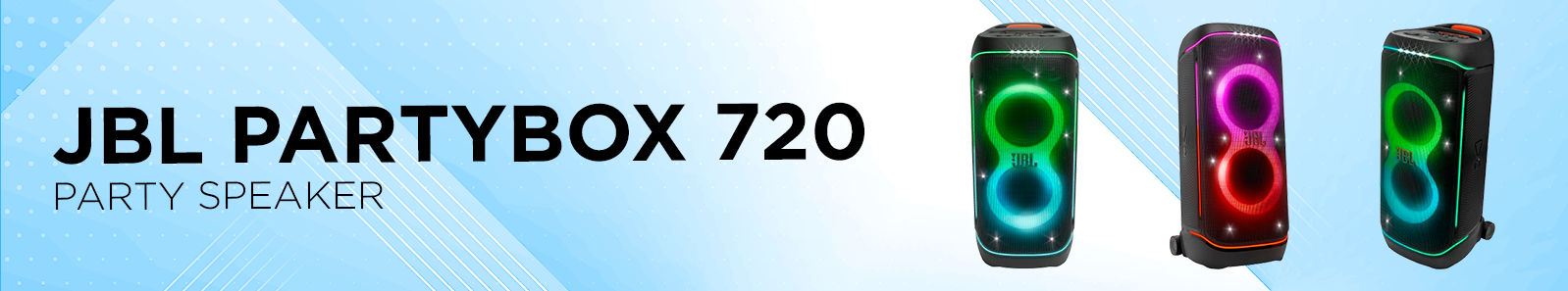 | Features | JBL PartyBox 720General Specifications Power Input: 100 – 240 V ~ 50 / 60 Hz Output Power: 800 W RMS (IEC60268) Audio Specifications Transducer: 2 x 9 inch (243 mm) woofers, 2 x 1.25 inch (30 mm) dome tweeters Frequency Response: 32 Hz – 20 kHz Signal-to-Noise Ratio: > 80 dB