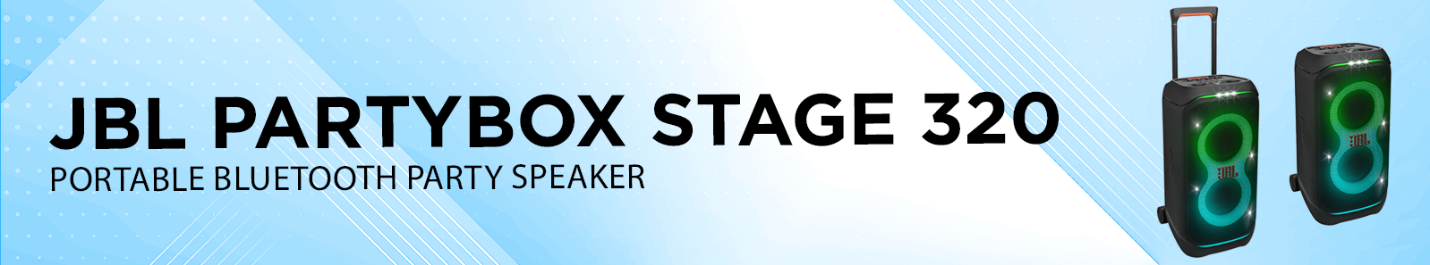 | Features | JBL PartyBox Stage 320Transducers: 2 x 5.25 inch (133mm) woofers, 2 x 2.25 inch (57mm) tweeters Output power: 160 W RMS (IEC60268) Power input: 100 - 240 V ~ 50/60 Hz Frequency response: 40 Hz - 20 kHz (-6dB) Signal-to-noise ratio: > 80dB Battery type: JBL BATTERY200 Li-ion polymer 34 Wh (equivalent to 7.2V / 4277mAh) Battery charge time: 3.5 hours (speaker off mode) Music play time: up to 12 hours (varies by volume level and audio content) Cable type: AC power cable (type varies by regions) Cable length: 2.0 m / 6.6 ft USB charge out: 5V / 2.1A (Max) (speaker off mode) USB format: FAT16, FAT32 Bluetooth® version: 5.4 Bluetooth® profile: A2DP V1.4, AVRCP V1.6 Bluetooth® transmitter frequency range: 2.4 GHz - 2.4835 GHz Bluetooth® transmitter power: ≤ 18 dBm (EIRP) Bluetooth® transmitter modulation: GFSK, π/4 DQPSK, 8DPSK Supported formats: .MP3, .WAV, .WMA, .FLAC Input Sensitivity: - Aux-In: 370mV RMS (3.5mm connector) - Mic-In: 20mV RMS - Guitar-In: 100mV RMS - Bluetooth/USB Input: -9dBFS Product dimensions (W x H x D): 288.4 mm x 570 mm x 297 mm / 11.35” x 22.44” x 11.69”
