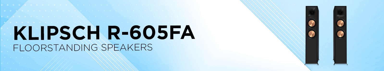 | Features | Klipsch R-605FA Dolby Atmos Floorstanding SpeakersFrequency Response: Main Channel: 38Hz - 21kHz +/- 3dB Height Channel Frequency Response: Conforms to Dolby Atmos Specifications Sensitivity: Main Channel: 96 dB @ 2.83V/1M (in-room) Height Channel Sensitivity: Conforms to Dolby Atmos Specifications Power Handling (Cont/Peak): Main Channel: 100W/400W Height Channel Power Handling: 75W/150W Nominal Impedance: Main Channel: 8 ohms Compatible Height Channel Impedance: 8 ohms Compatible Crossover Frequency: 1,440 Hz High Frequency Driver: Main Channel: 1" Aluminum LTS tweeter with 90 x 90 square Tractrix Horn Height Channel High Frequency Driver: 1" Aluminum LTS tweeter with 90 x 90 square Tractrix Horn Low Frequency Driver: Main Channel: Dual 6.5" spun-copper TCP woofers Height Channel Low Frequency Driver: 5.25" spun-copper IMG woofer Enclosure Material: MDF Enclosure Type: Main Channel: Bass-Reflex via rear-firing Tractrix ports Height Channel Enclosure Type: Acoustic Suspension Inputs: Single Gold Plated Binding Posts Dimensions (H x W x D): 1017 x 240 x 463 mm Weight: 22.7 kg Finishes: Black Textured Wood Grain Vinyl Accessories: Injection molded feet & screws