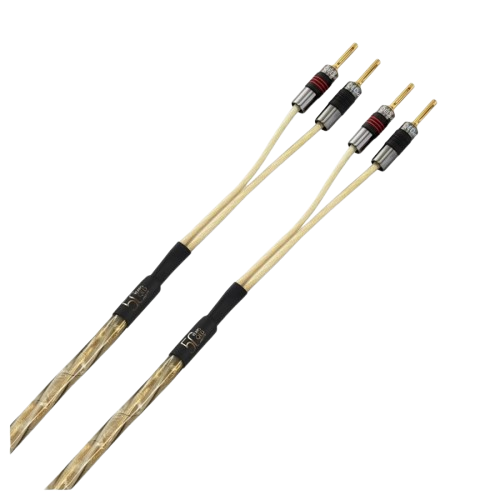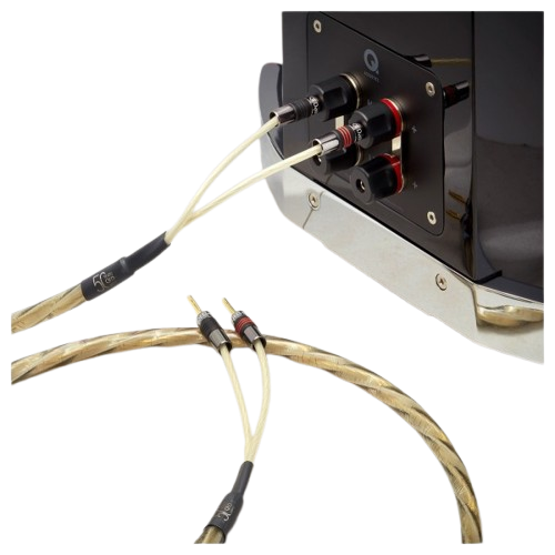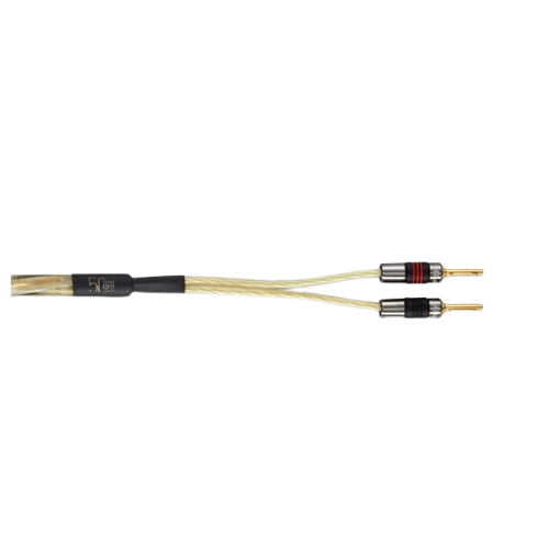 | Features | Cross-sectional area: 2.5 mm2 Wire gauge: 14 AWG Jacket outside diameter: 11.5 mm Loop inductance: 0.58 μH/m Loop resistance: 14.8 mΩ/m Capacitance: 42.0 pF/m Dissipation factor @ 10 kHz: 0.0090 Conductors: 9 x 19/0.13 mm OFC + 1 x 19/0.13 mm UP-OCC Insulation: LDPE jacket with 100% coverage of golden/mylar tape wrap Plugs and spades: QED Airloc™ Forte banana plugs |