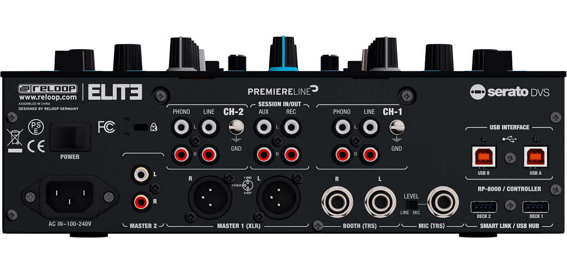Reloop Elite - Flagship Scratch MixerFrequency Response: 20 Hz - 20 kHz Inputs: 2x Phono RCA, 2x Line RCA, AUX RCA, Mic/Line TRS, 2x Smart-Link USB ports (Type A), 2x USB ports (Type B) Outputs: Master XLR (balanced), Master RCA (unbalanced), Booth TRS (balanced), Rec RCA (unbalanced), Headphones 6.3 mm / 3.5 mm jack EQ Range (70 Hz, 1 kHz, 13 kHz): -∞ dB (total kill) / +9 dB Mic EQ Range (100 Hz, 10 kHz): -12 dB / +12 dB Dimensions (W x D x H): 290 x 414 x 107.5 mm (potentiometers: 18.5 mm) Weight: 6 kg Accessories Included: Full version of Serato DJ Pro with DVS Expansion Pack, 2x Serato Control Vinyls with NoiseMap™ technology, USB cable, power cord, operating instructions, and 90 days BPM Supreme Premium membership